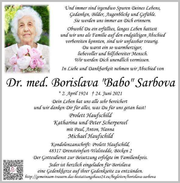 Нека само помолим Бог да вземе госпожа Борислава Сърбова в своите любещи ръце и я пренесе през всички граници и всички мрачини на живота, който води началото си от Исус Христос.