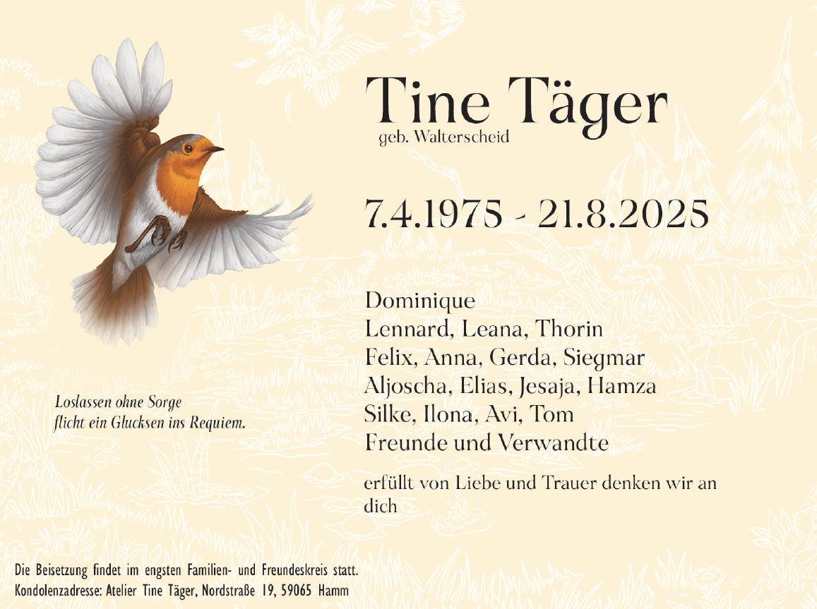 Für dich, liebe Tine, eine Kerze voller Licht und Wärme. Du bleibst in meinen Erinnerungen lebendig, in jedem Strich, jeder Farbe, jedem Lachen.