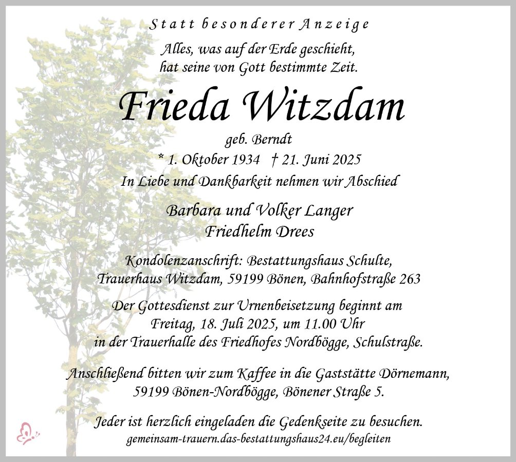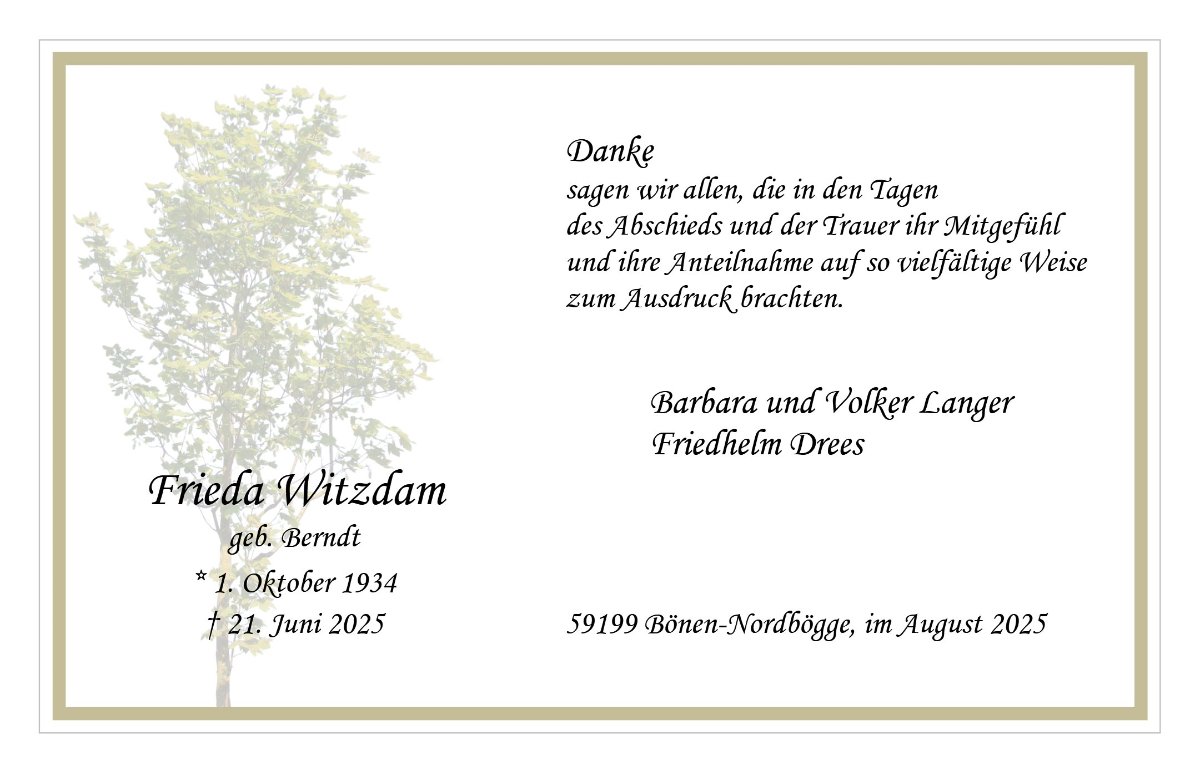 mit tiefem Mitgefühl habe ich vom Tod von Tante Frieda erfahren.