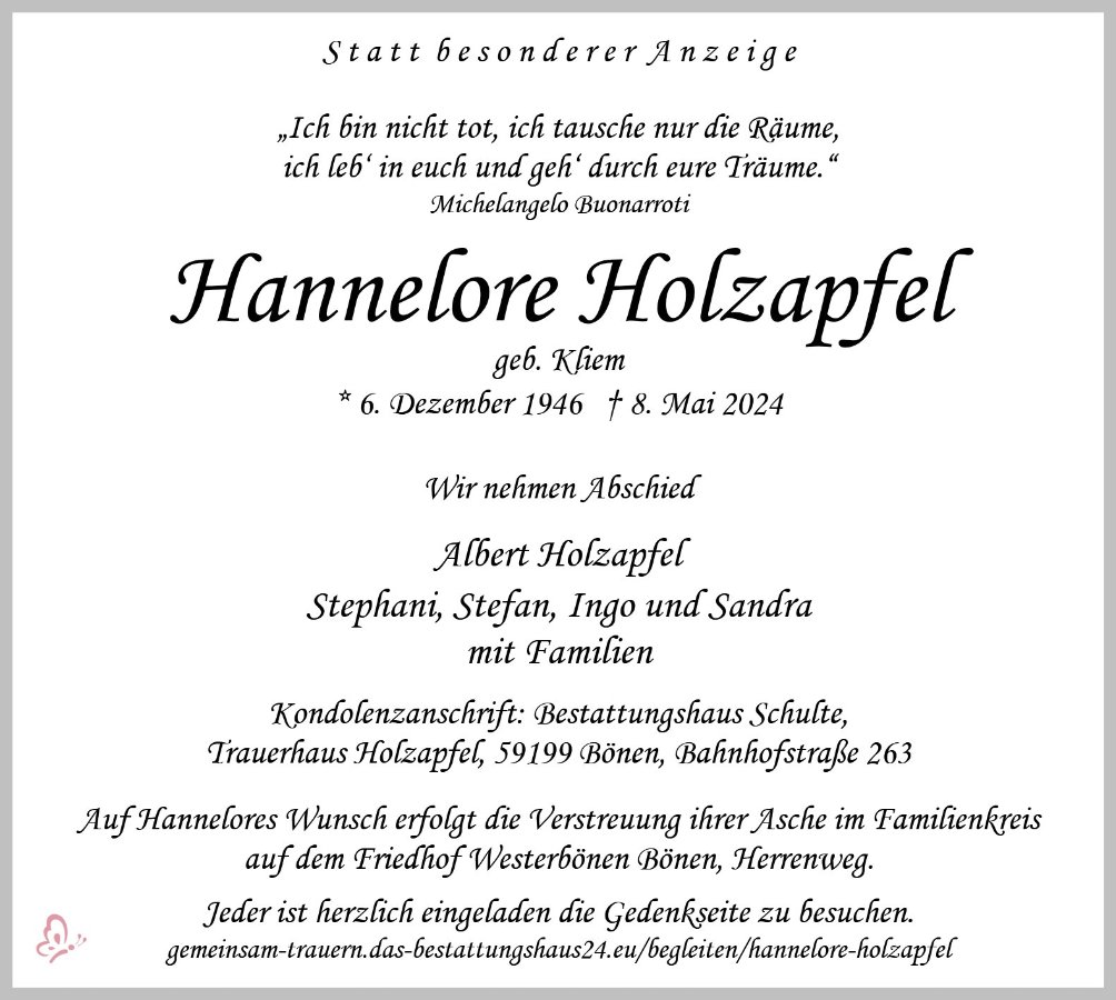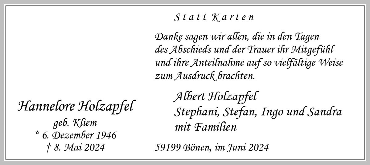…Ich habe es gerade erfahren, dass meine liebe Frau Holzapfel nicht mehr bei uns ist. Sie hat mir viele Jahre durch schwere Zeiten geholfen.