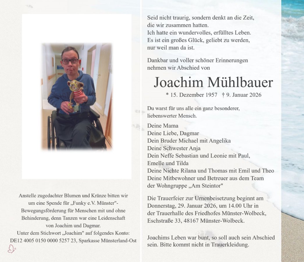 wir waren Jahre wie "Zwillinge". Ein Bruderpaar, das die ersten Jahre aufgewachsen ist, als wäre es am gleichen Tag geboren. Es ist rückblickend so schön, dass wir uns bei aller Verschiedenheit so nah waren. Leider geht das nicht ein Leben lang. Lieber Joachim, ich bin bei Dir und es wird der Tag kommen, an dem wir wieder vereint sein werden. Ich bin froh und stolz, dass ich Dich als Bruder hatte. Du hattest durch die Liebe aller, die Dich umgaben, ein unbeschwertes Leben. Ich werde in alle Ewigkeit Dein Bruder bleiben, der Dich beschützt.