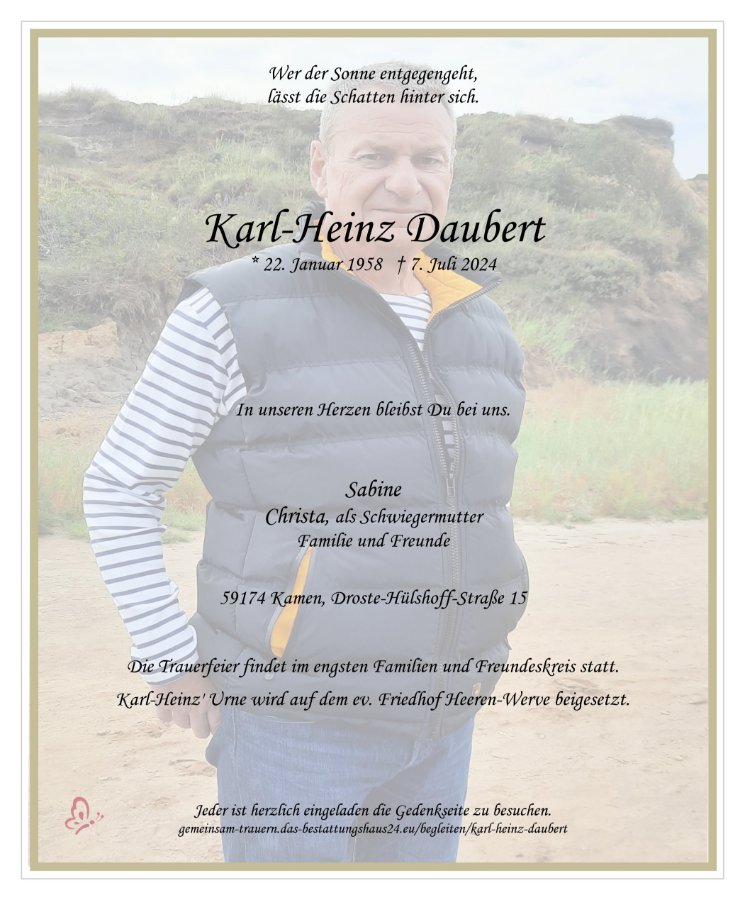 Mit Bestürzung musste ich gestern 08.08.2024, bei der Beisetzung meines Onkels, auf dem Heerener Friedhof feststellen, dass Karl-Heinz Daubert von uns gegangen ist...(und neben meinem Onkel beigesetzt worden ist).