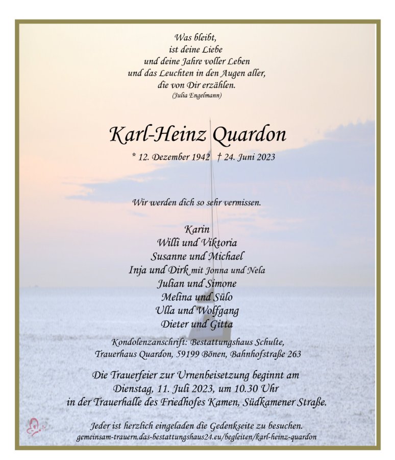 Wir sind auch sehr traurig und trauern mit euch.Wir werden uns immer an die schöne Zeit mit Karl-Heinz erinnern.