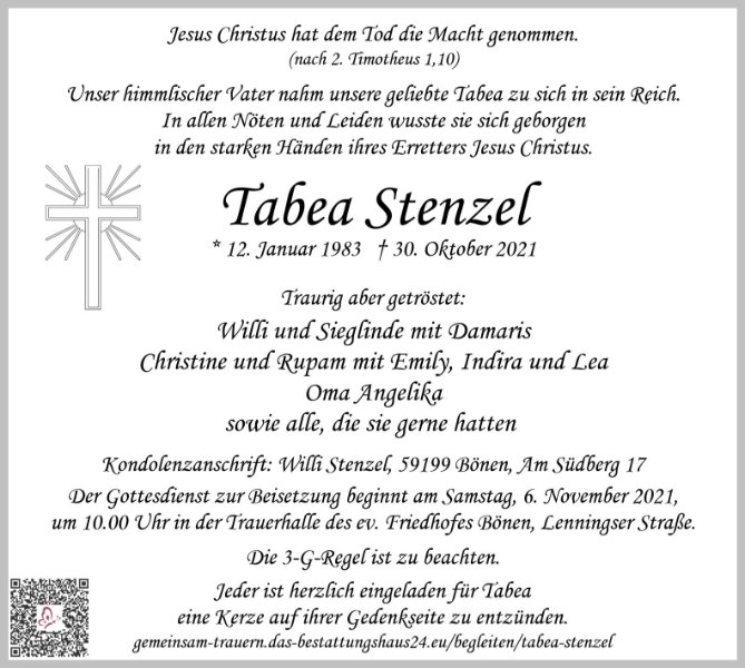 Liebe Tante Tabea, Ich vermisse dich sehr .Gestern wäre dein Geburstag gewesen es ist schade dass wir nicht mehr mit dir feiern können. Ich werde dich nie vergessen . Lea