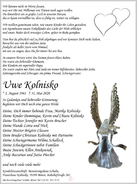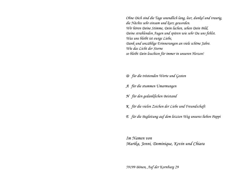 Meine Gedanken sind so oft bei Dir und gerade jetzt wünschte ich mir Deine Schulter zum anlehne, Dein Gehör um auch mal Sorgen los zu werden, Deine Umarmung, welche mir Trost gab, wenn es mal schwierig war, Deine Stimme für viele Gespräche über die Kinder, unsere Träume und vieles mehr.